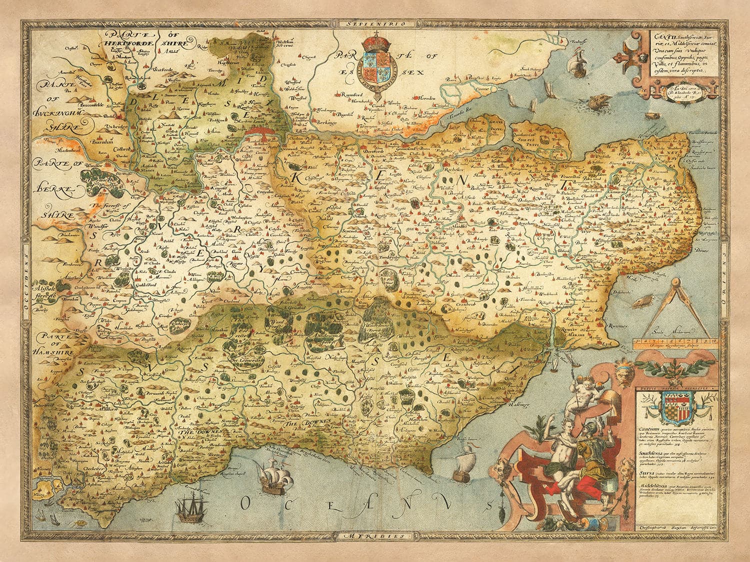 Most of the towns and cities of the southeast counties, and the London towns that would eventually become boroughs, are clearly visible in this map. Adding to the map's charm, most towns are spelt in their Early Modern English forms