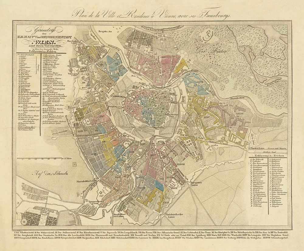 Old Map of Vienna by Tranquillo Mollo in 1803: Augarten, Praterstern, Franzensbrucke, Burggarten, City Park