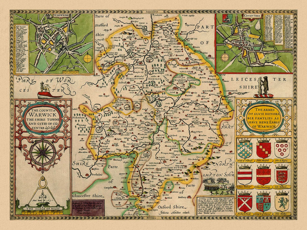 This old, full colour and exceedingly rare map shows the ancient county of Warwickshire as it was in 1611. It was created by John Speed and engraved by Jodocus Hondius, and originally published in Speed's "The Theatre of the Empire of Great Britaine".
