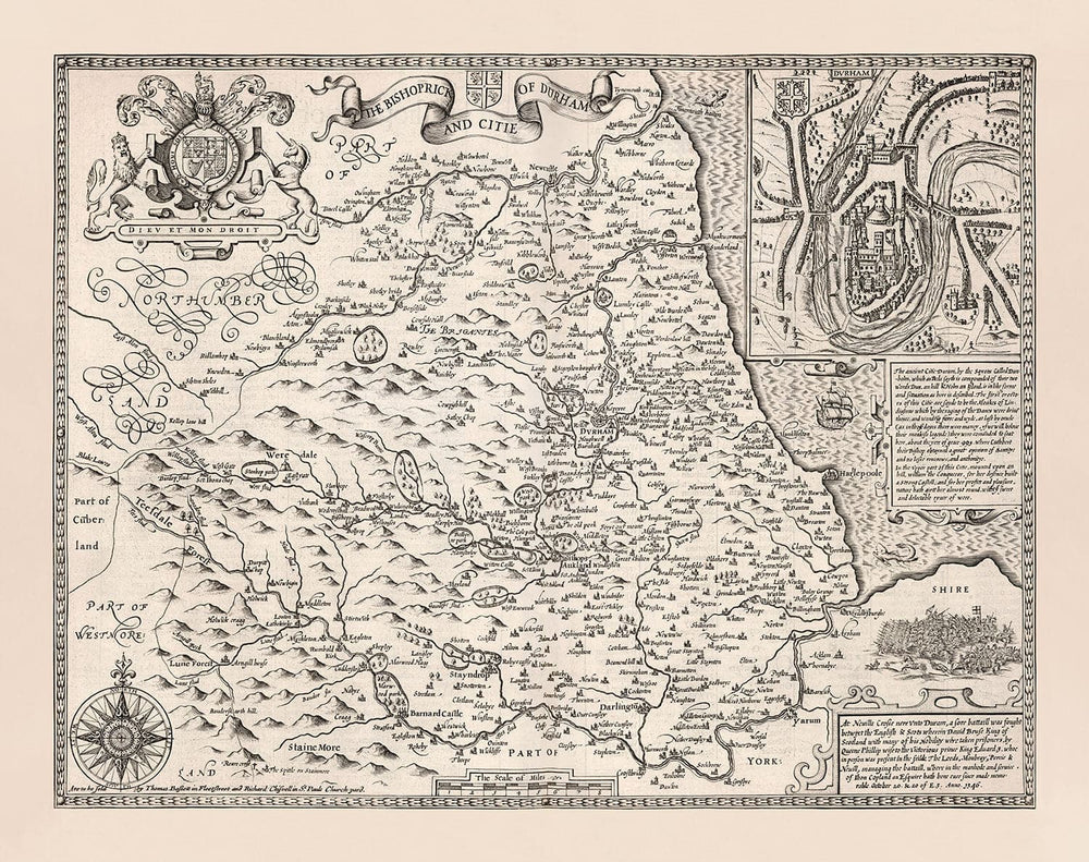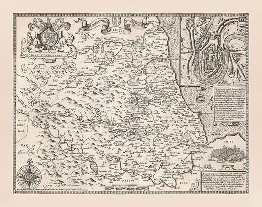 Old Monochrome Map of County Durham, 1611 by John Speed: Darlington, Stockton-on-Tees, Sunderland, Newcastle