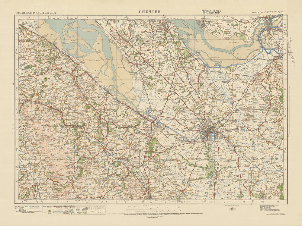 This Old Ordnance Survey Map, Sheet 43 - Chester, 1925, provides a fascinating glimpse into the past with its detailed depiction of the Chester region in England and Wales. This map showcases several towns, cities, and interesting features, including Flint, Widnes, Ellesmere Port, Mold, and the Clwydian Range and Dee Valley Area of Outstanding Natural Beauty (AONB).