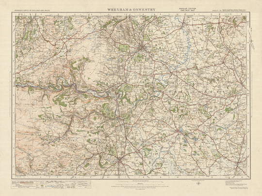 The "Sheet 51 - Wrexham & Oswestry" map from Ordnance Survey's One-inch "Popular" edition, England and Wales, published in 1925, is a remarkable piece of cartographic history. This meticulously detailed map showcases the towns of Wrexham and Oswestry, along with other notable settlements such as LLangolen, Wem, Ellesmere, and Malpas.