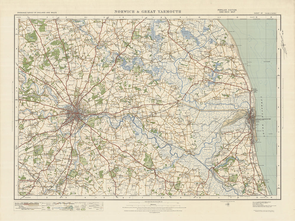 Immerse yourself in the past with the "Sheet 67 - Norwich & Great Yarmouth" map from 1925, and explore the historic county of Norfolk with its charming towns, picturesque landscapes, and intriguing history.