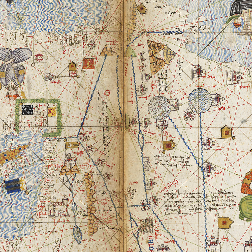 Political and spiritual cartography interlace across the sheet. Crosses signal Christian strongholds; domes and other emblems mark Islamic and non-Christian cities; and a riot of colored banners records the shifting allegiances of empires and towns. The realms of the Golden Horde are plotted alongside major European and North African cities and bustling Mediterranean ports—centers of maritime trade set amid a mesh of rhumb-like bearings radiating from the compass rose. The Atlas’s unique orientation, with images and text turning toward the edges, reinforces its function as a table atlas meant for consultation. Readers could decode sovereignty, faith, and commerce at a glance, a clarity unmatched in contemporary mappae mundi or purely nautical charts.