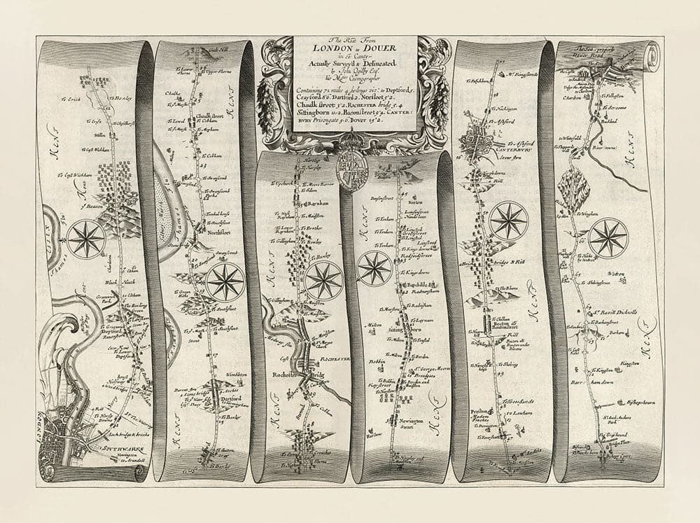 Old Road Map of London to Dover, 1675 by John Ogilby: Historic Kent A2 Travel Map