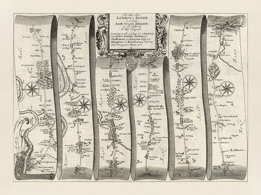 The map starts in Southwark and heads southeast through Blackheath and Dartford and then into Kent, wending down through Rochester, Sittingbourne, Canterbury and eventually onto the coast in Dover. The map says the road was 71 miles long - a little shorter than today's route, which would take about 75 miles. The map roughly follows the route of the modern day A2 road.