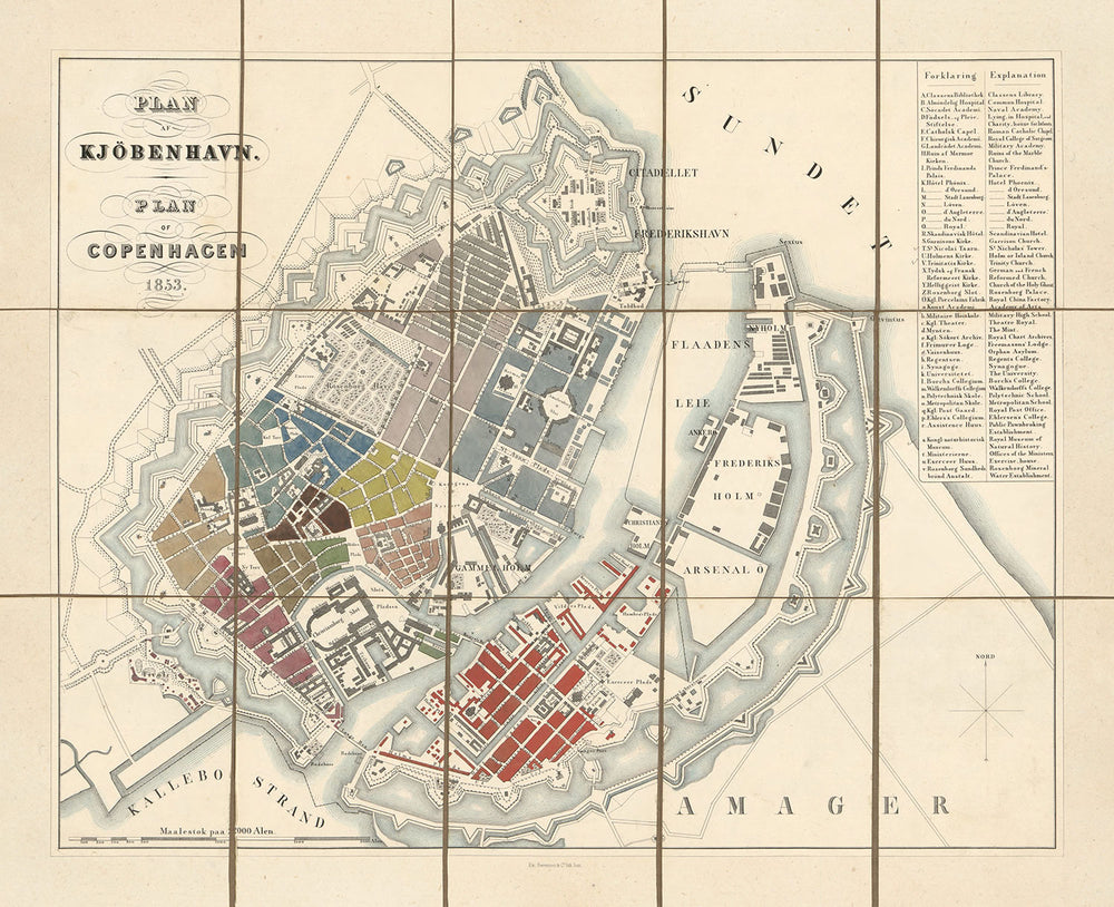 Old Street Map of Copenhagen in 1853 by Millard Fillmore: Borsen, Holmen, Kastellet, Christianshavn, Slotsholmen