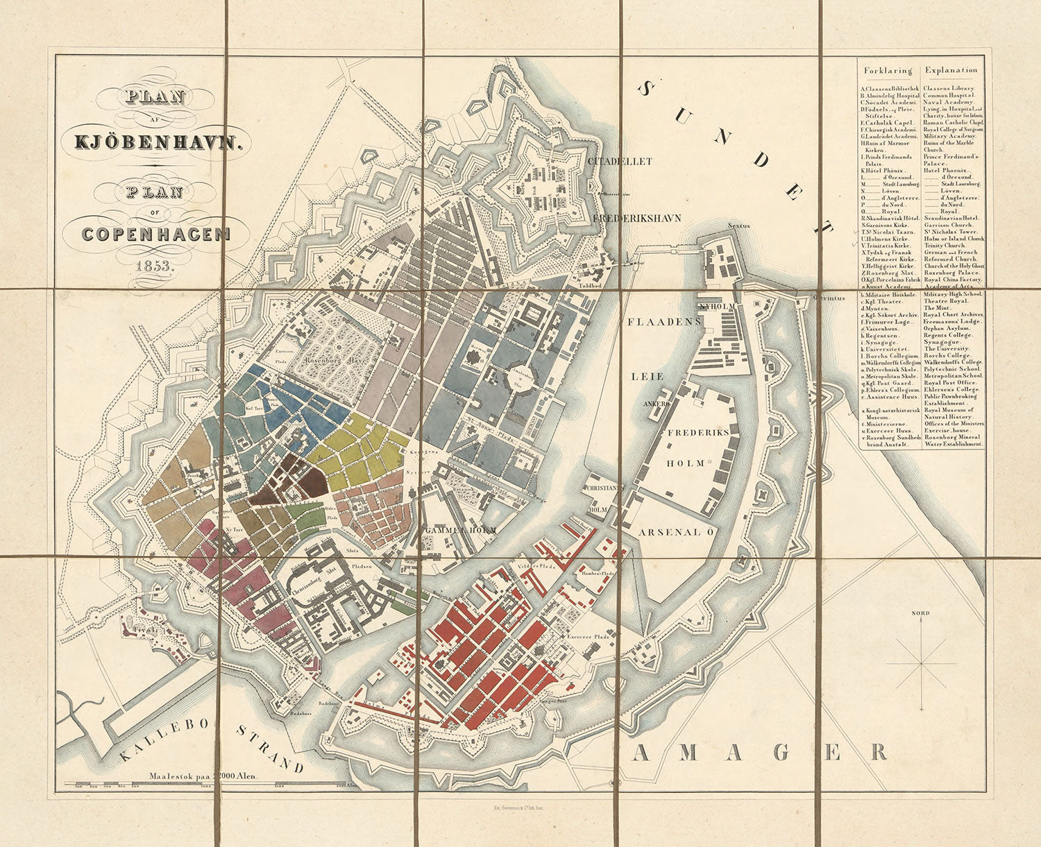 This is an early colourful city street map of Copenhagen, a few years after King Frederik VII converted Denmark into a constitutional monarchy.