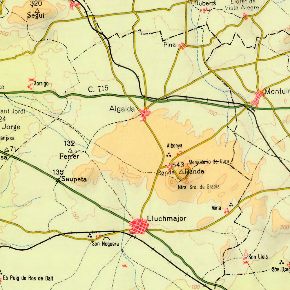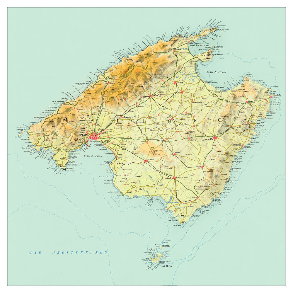 Titled simply Mallorca, this 1963 topographical portrayal of the largest Balearic island maps the meeting of mountain and sea with exacting, mid‑century poise. Hypsometric tints grade the relief—from sun‑washed lowlands to the cool, shadowed escarpments—while close-set contour lines render the island tactile, especially along the Alfabia Mountains that crown the west. Around the littoral, the Balearic Sea is articulated by crisp coastlines, capes and bays studded with depth figures, guiding the eye from the wide embrace of Palma Bay to the scalloped coves of the north. Across the interior, symbols pace out villages, parish towns, and rural hermitages; major and secondary roads braid them into a coherent network. The sheet fixes Mallorca at a moment of change, preserving the island’s pre-resort physiognomy with official precision and an artist’s reverence for form.