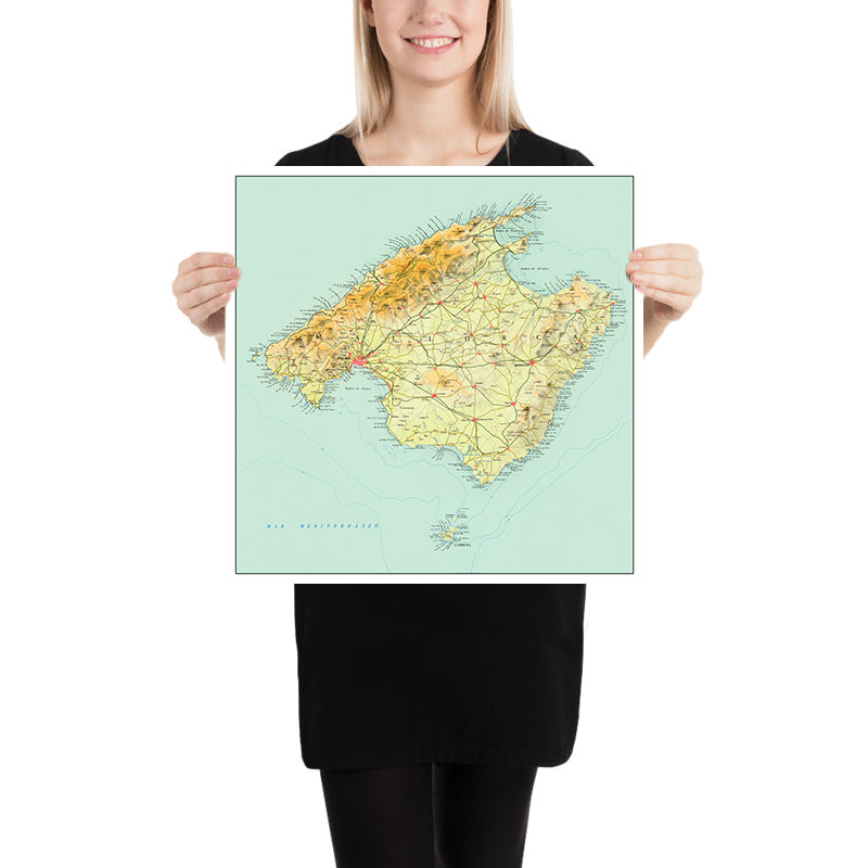Human settlement is mapped as a living lattice. Palma, the capital, radiates roads across the island, their hierarchies plainly graded as they climb toward the passes and fold back to the plains. Inca sits inland as a pivotal market hub on the way north, while Manacor anchors the east with links to Felanitx and the surrounding Llevant countryside. Marratxí bridges Palma’s metropolitan reach; Sineu marks the island’s heart at a historic crossroads. Along the northern bays, Alcúdia and Pollença face sheltered waters and fortified histories. Primary routes and lesser caminos are traced with care, revealing how movement threads through orchards and terraces, over saddles in the Alfabia chain, and out toward fishing ports. The cartography also situates Mallorca within its archipelago, with coastal orientation points acknowledging the sea road toward Mahón.