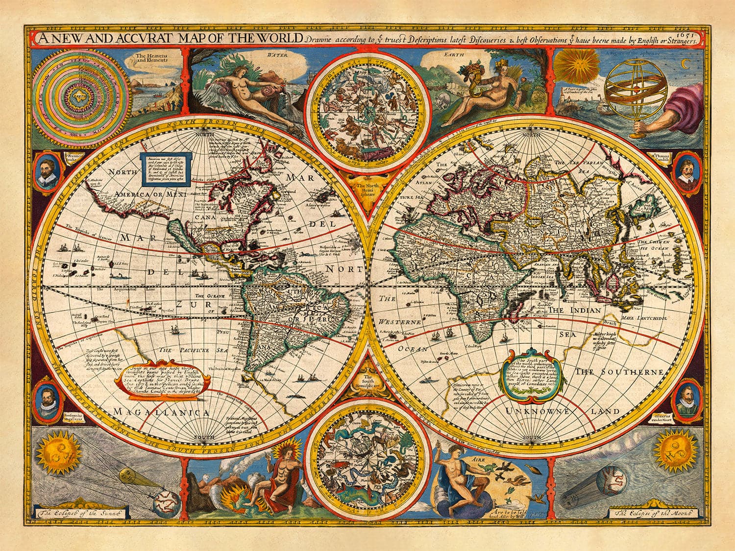 Back in 1651, our understanding of the world wasn't quite what it is today. California is an island! And there's no Antarctica or Australia - just the 'Southern Unknown Land'. Take a closer look at North America and there are some very early settlements on there - including some that have been completely fabricated by the mapmaker! And why does North America swing off wildly to the west in the top corner?