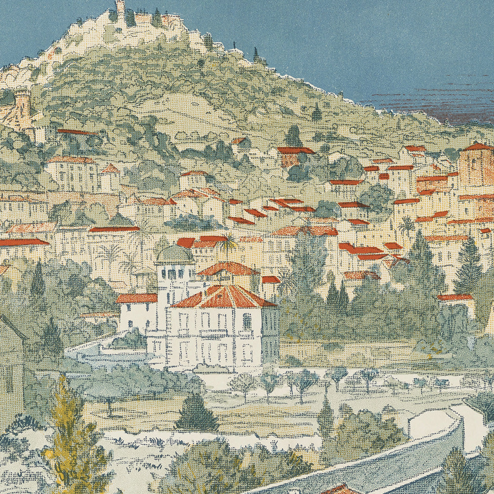 Design and color: Grasset’s composition balances flat, decorative planes with organic line, hallmarks of Art Nouveau. The poster’s cool blue upper register settles into olive greens and sunlit yellows below, a triad that suggests Mediterranean sky, wooded slopes, and golden flora. The flowing letterforms at the header set a lyrical rhythm echoed in the landscape contours—an ornamental unity that turns a timetable announcement into fine art. Lovers of color-forward interiors will appreciate how the blue-green ground instantly harmonizes with natural woods, linen, and stone, while yellow notes add a cheerful accent.