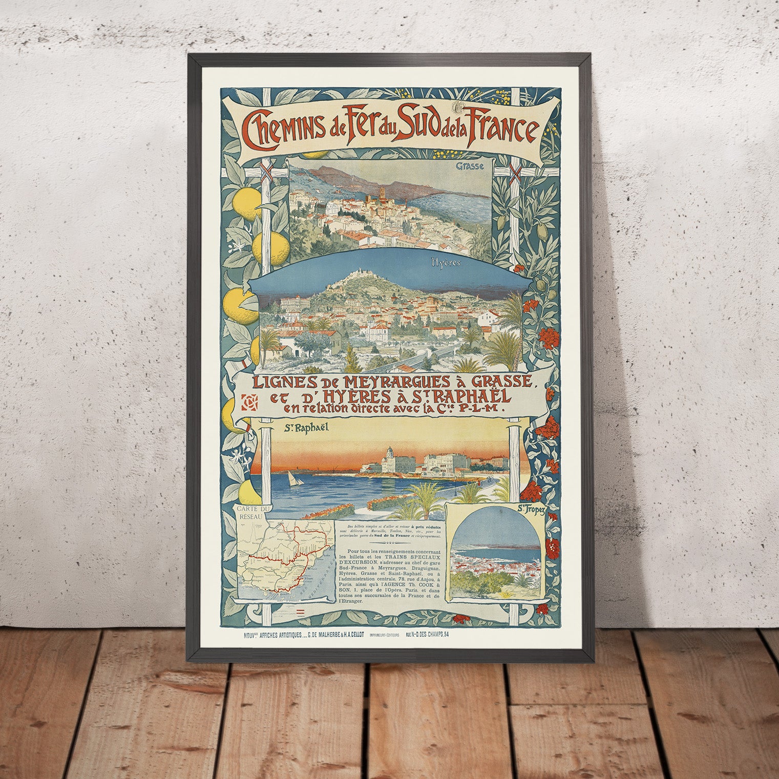 Why this subject matters: the line from Meyrargues to Grasse cuts across Provence, bridging the limestone hills north of Aix-en-Provence with the Riviera’s perfumed uplands. Grasse, famed for jasmine, rose, and orange blossom, became a byword for luxury fragrance during the 19th century; this poster captures that allure. For travelers who have wandered the Luberon, followed cypress-lined roads, or traced the old railway corridors, it’s a visual keepsake of the South of France’s distinctive light, color, and scent.