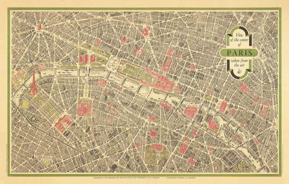 Ah, the finest map ever made of Paris, put together by Georges Peltier in 1950. This is a birds-eye map of Paris, or, as the map states, 'a view of the centre of Paris taken from the air'.