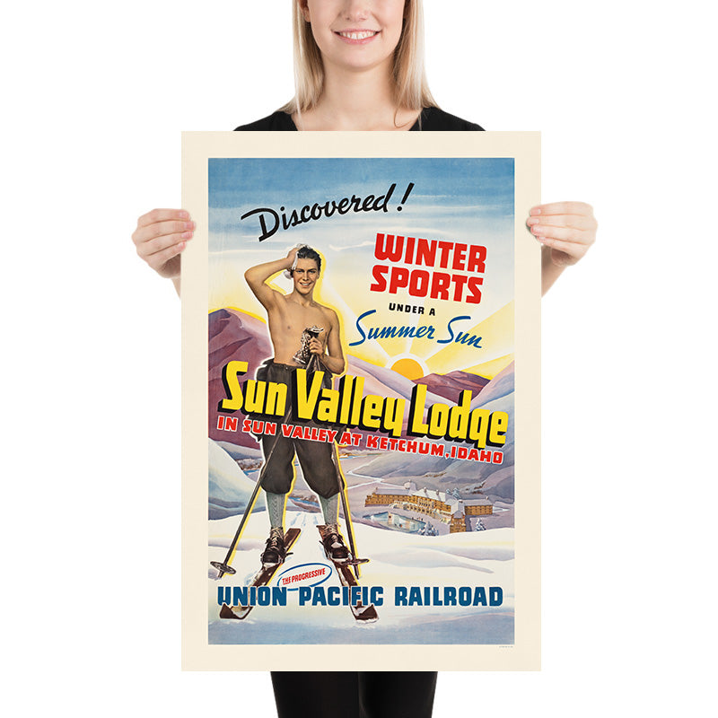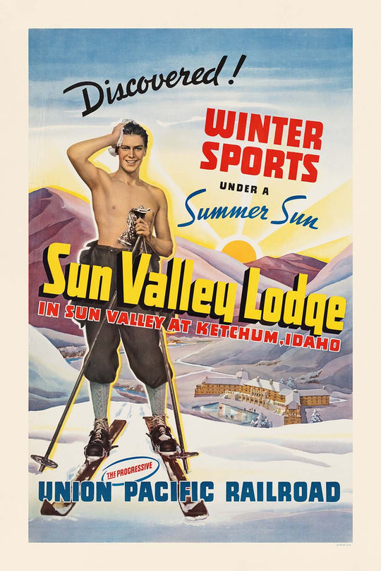 Discovered! Winter sports under a summer sun. Sun Valley Lodge in Sun Valley, at Ketchum, Idaho is a classic American ski poster issued for the Union Pacific Railroad by an unknown designer in the mid-20th century. Created to introduce travelers to the brand‑new resort of Sun Valley, the image places a confident, smiling skier front and center—goggles in hand, shirtless in the sparkling winter light—while a radiant yellow sun breaks over purple mountains and a miniature vignette of the Sun Valley Lodge glows below. The promise is pure Rocky Mountain optimism: snow‑sure trails and crisp blue skies.