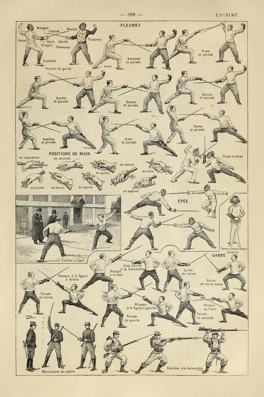 This particular artwork stands out for its clear, graceful lines and timeless Victorian charm. Millot masterfully illustrates the graceful precision and disciplined movements involved in épée fencing, carefully demonstrating fundamental positions and techniques. The composition is both visually engaging and historically significant, providing a fascinating insight into the art and science of fencing as it was practiced at the height of its popularity in the Victorian era.